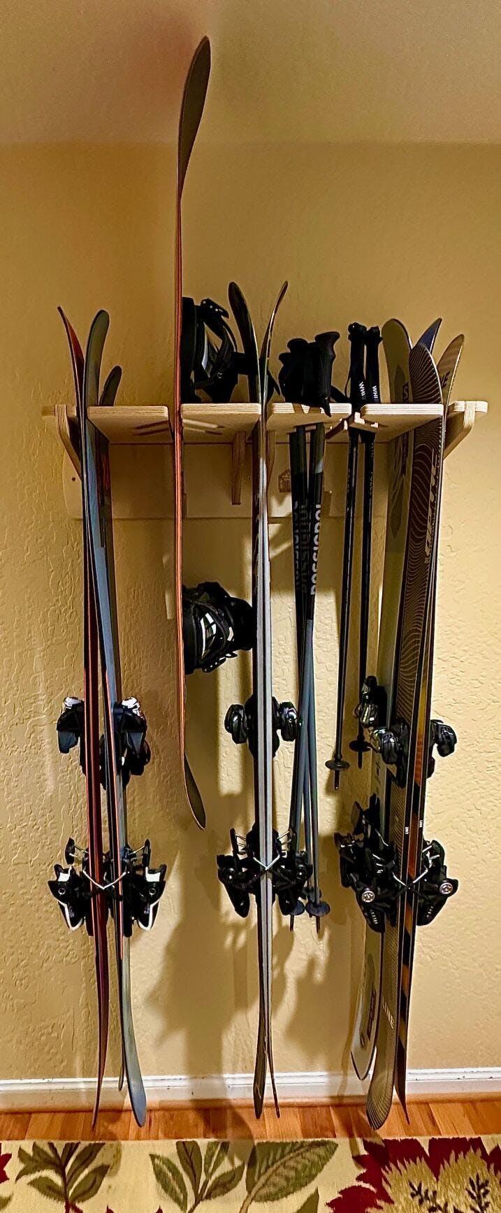 The Ponderosa can hold up to 6 pairs of skis or 5 snowboards with bindings. You can also mix and match skis and snowboards. The Ponderosa gets it's name from it's unique slot system that allows poles to be stored efficiently. This rack comes with 2 hooks for helmets, backpacks, jackets, or any other gear.